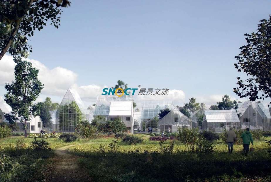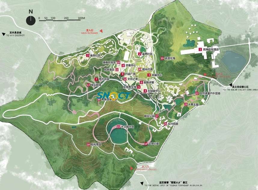 復雜的河谷沖溝地形與嚴苛的干熱河谷氣候是本項目最大的設計挑戰,規劃通過日照光環境、氣溫、降雨、風環境等條件,進行合理化的規劃布局、制定建筑設計策略以及創新引入雨洪管理系統,解決當地度假康養、娛樂休閑等業態所必須的居住環境、景觀環景與生態環境所面臨的一些列挑戰。同時抓住當地歷史文脈與地域資源,以“核心綠谷”為規劃理念,形成了以“水果之都、康養之城、太陽之源”為特色優勢,以“西極昧谷,太陽之源,顓頊故里,傈僳之鄉”為文化主題的特色康養度假田園綜合體。