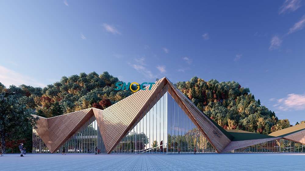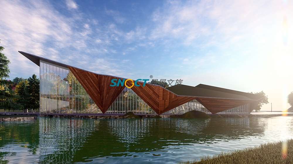 本項(xiàng)目建筑面積約2500平方米。方案設(shè)計(jì)上提取奶子溝“彩林、冰山、河川、生態(tài)”的印象標(biāo)簽,以“融合”為核心,將其貫穿起來,形成了“水為形,山為勢,山川一體”的設(shè)計(jì)概念,對標(biāo)國際冰川彩林旅游度假目的地的設(shè)計(jì)要求。