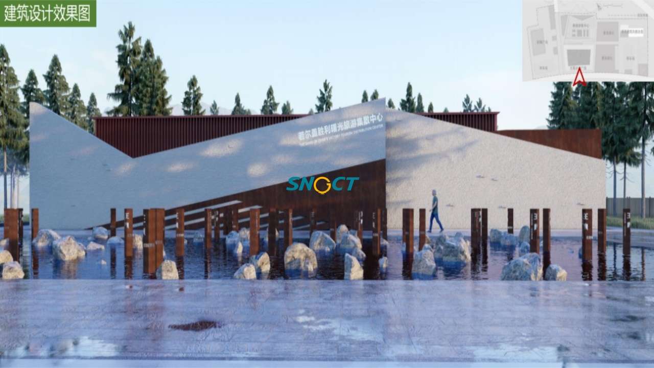游客服務中心組團設計:“勝利曙光”游客服務中心位于若爾蓋縣城東側,距離縣城約15km,地處通往紅色革命村落門戶位置。服務中心場地基本硬化平整,場地西側有紅色革命雕塑廣場,場地內現設有小車位45個,特產售賣商店等;建筑景觀風貌欠佳,功能較為混亂。計劃在原有舊址基礎上對游客服務中心進行整體化設計,新建游客中心,進行建筑風貌改造。融入紅色文化,融合草原雪山的設計元素,以硬朗的建筑輪廓寓意紅軍過草地的艱苦頑強,亢勇不屈的長征精神。